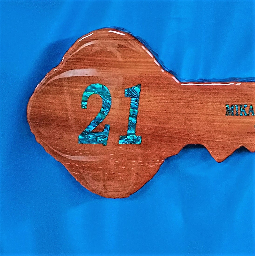 When you purchase a 21st Key please make sure you add your phone number, so that I can contact you if I need to. In the comments please let me know your requirements for the key i.e. Persons name and birthdate, whether you want it laser engraved or writing done in Natural Paua or Gold foil etc. Paua and or Gold/ Foil add $25. The 21 and six letters for a name are free but further letters, numbers and/or comments will incur extra cost. Obviously, Congratulations Happy Birthday Dalphinus Lorde-Thompson 21/04/2028 is a lot more work. ;-) But feel welcome to talk about adding shapes or symbols.